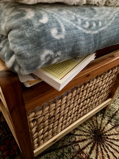 Then, I got up momentarily, and when I returned, there was a book sticking out noticeably from under a stack of items and blankets. That book had been there for weeks, maybe months. Until now, it has never been out of place.