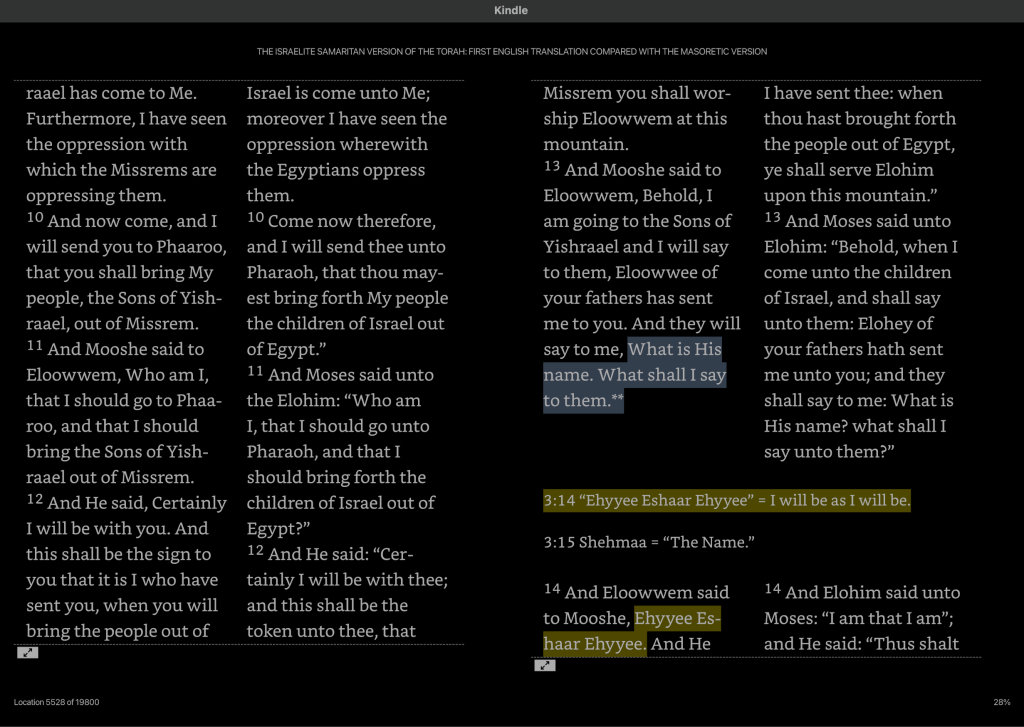 Anyway, to get to the point, see in the screenshot below how the Samaritan Torah records God answered Moses when Moses asked God’s name. For reference, you are looking at two pages here side by side (like an open book, and each page has two columns). For each page, the left column shows the Samaritan Torah and the right column shows the Masoretic Text.