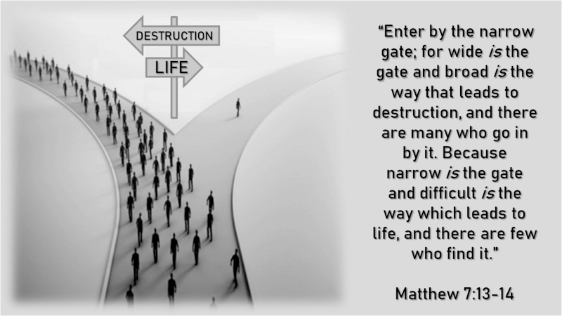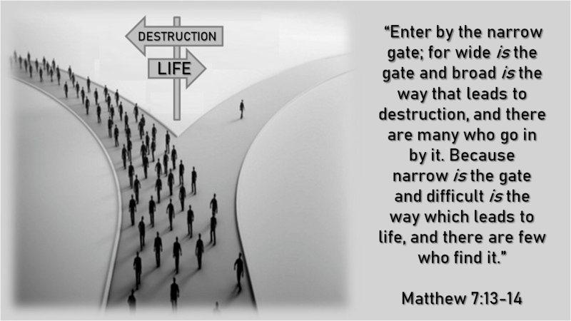 “Enter by the narrow gate; for wide is the gate and broad is the way that leads to destruction, and there are many who go in by it. Because narrow is the gate and difficult is the way which leads to life, and there are few who find it.” Matthew 7:13-14