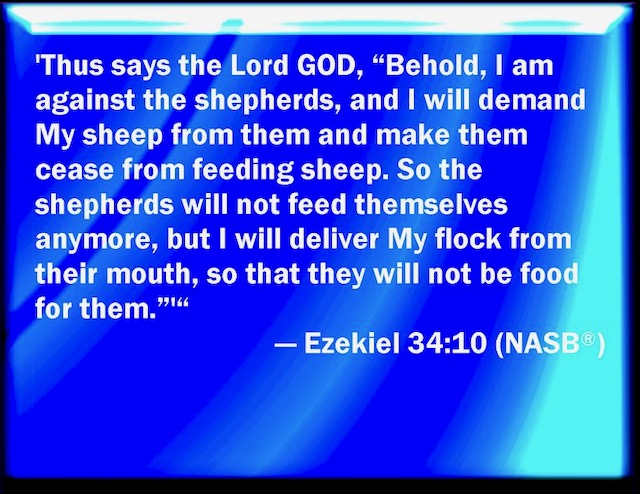 7 ‘Therefore, you shepherds, hear the word of the Lord: 8 “As I live,” says the Lord God, “surely because My flock became a prey, and My flock became food for every beast of the field, because there was no shepherd, nor did My shepherds search for My flock, but the shepherds fed themselves and did not feed My flock”— 9 therefore, O shepherds, hear the word of the Lord! 10 Thus says the Lord God: “Behold, I am against the shepherds, and I will require My flock at their hand (take back my people from their rule); I will cause them to cease feeding the sheep, and the shepherds shall feed themselves no more; for I will deliver My flock from their mouths, that they may no longer be food (a meal ticket) for them.”